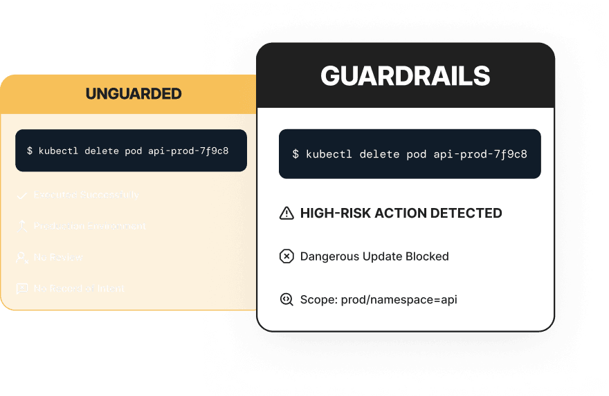 Protect production uptime from ad-hoc scripts and AI-generated mistakes.